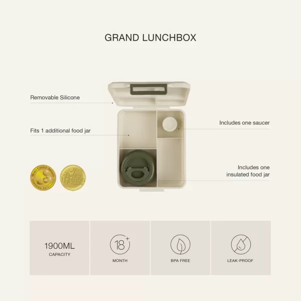The Grand Lunch box consists of 4 separate compartments to keep each food separate when needed, 1 thermos Food Jar for hot meals, and 1 Sauce Container to store your favourite dip. Easy to clean and totally leakproof, it can fit both a lunch & a snack in to see you through the day (up to 1900ml)