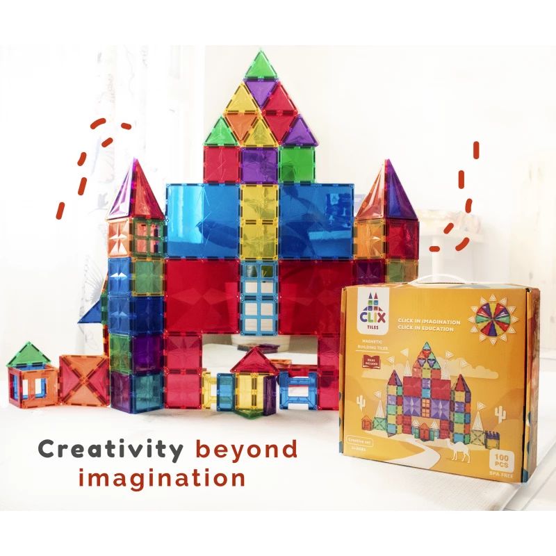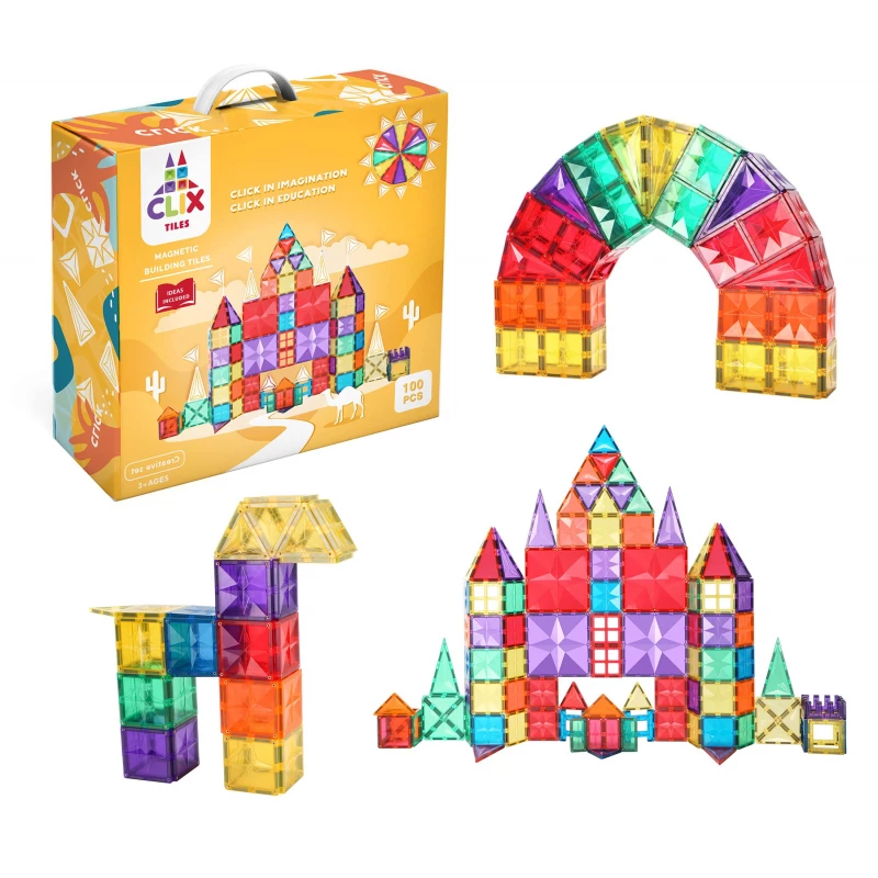 - 100 pieces set comes with 6 large squares which make it easier to builder bigger, taller structures, clixtiles have bigger, stronger magnets installed to ensure stronger and sturdier structures they are made from abs food-grade plastic which is 100% safe for kids from all ages