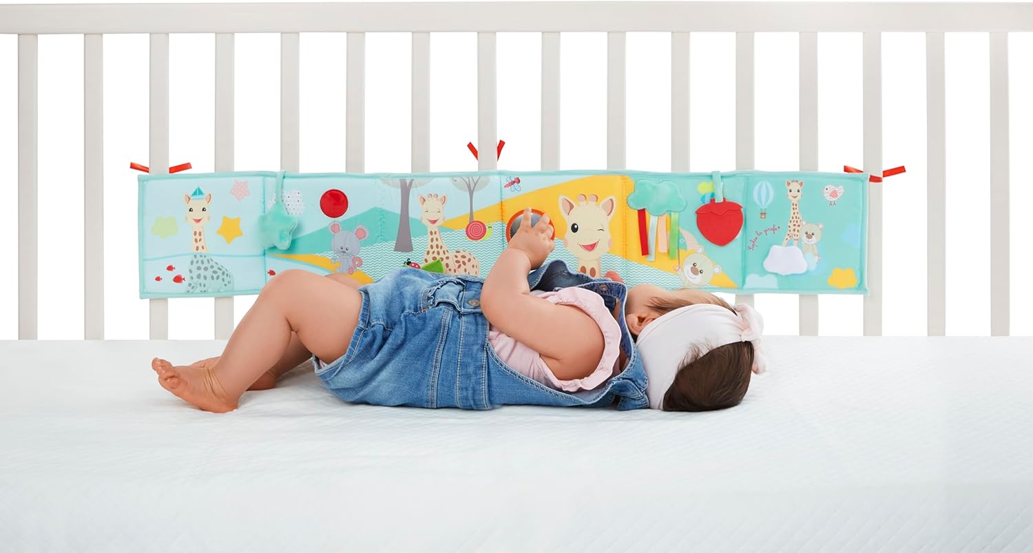 Foldable book to stimulate baby senses! Contains 12 illustrated pages with multiple activities: •Vibrant and contrasted colours •Ribbons and various materials (craft paper, Velcro…) •A squeaker •A mirror •A teething ring •bells Smart, this book can be placed on the ground, hung on the bed or in the play yard thanks to 6 ties. Unfold book: 16 x 94 cm. Washable