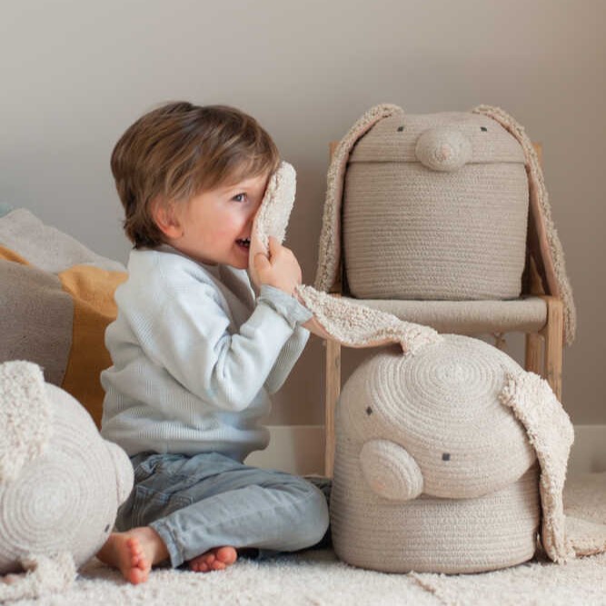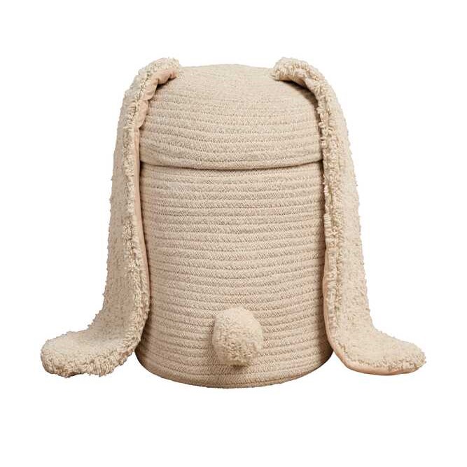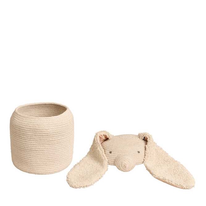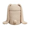 An oval-shaped bunny basket in natural color, handcrafted using braided cords made of fibers from recycled PET bottles mixed with our cotton. With extra long soft tufted ears and a rounded nose, the Rita the Rabbit basket is finished with a big cotton pompom as a tail.