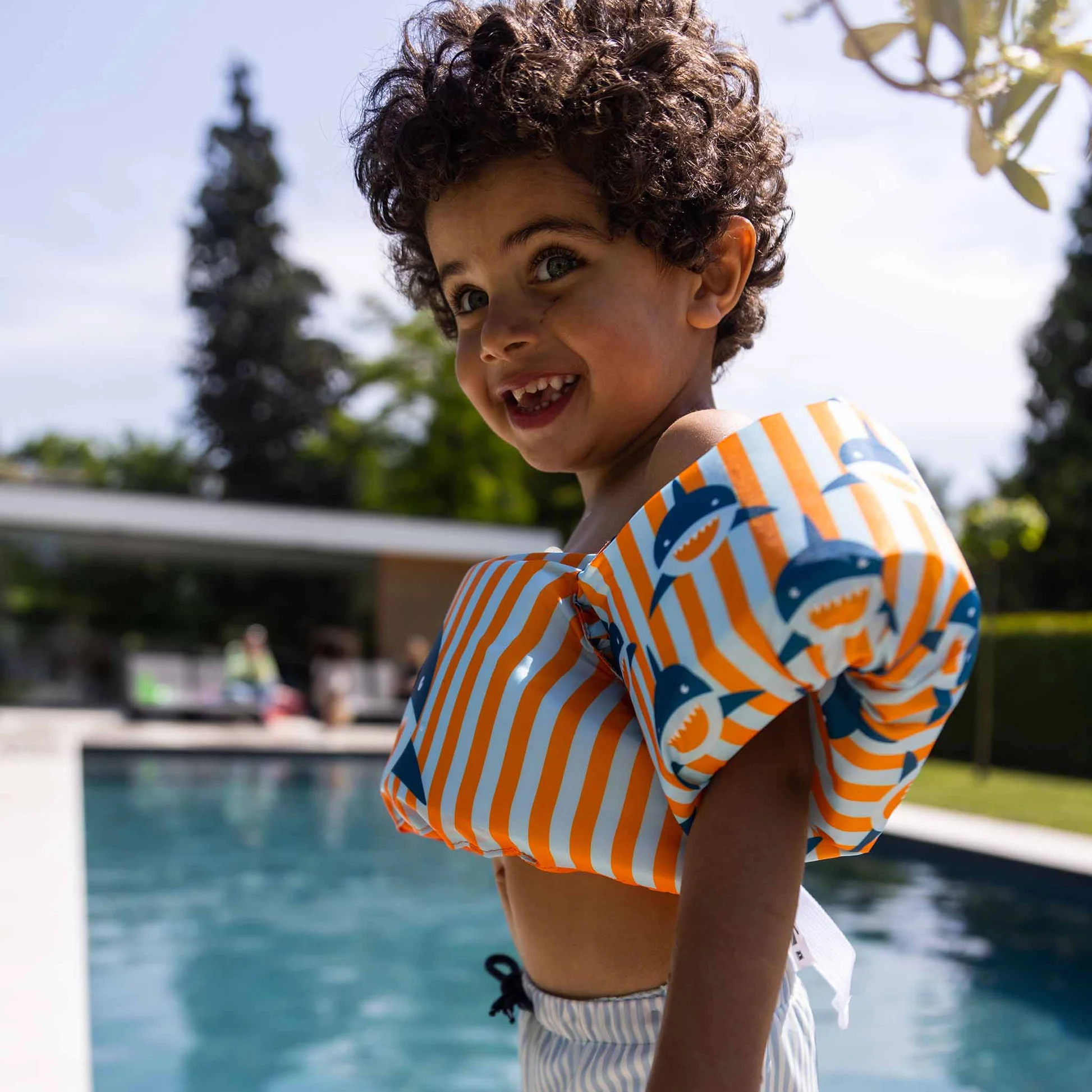 Enjoy the greatest water fun safely and stylishly. The Swim Essentials Puddle Jumper with cool Shark print is perfect! A puddle jumper is a must-have for safe swimming, a kind of combination between a life jacket and swimming armbands. The puddle jumpers are suitable for kids between 2-6 years (equal to 15-30 kg). The Puddle Jumper consists of one whole, including a part for the arms that is attached with a strap around the waist. The whole thing is held together by a buckle on the back, making it difficult for your child to take it off themselves. Because the inside is made of foam, your child will float well.