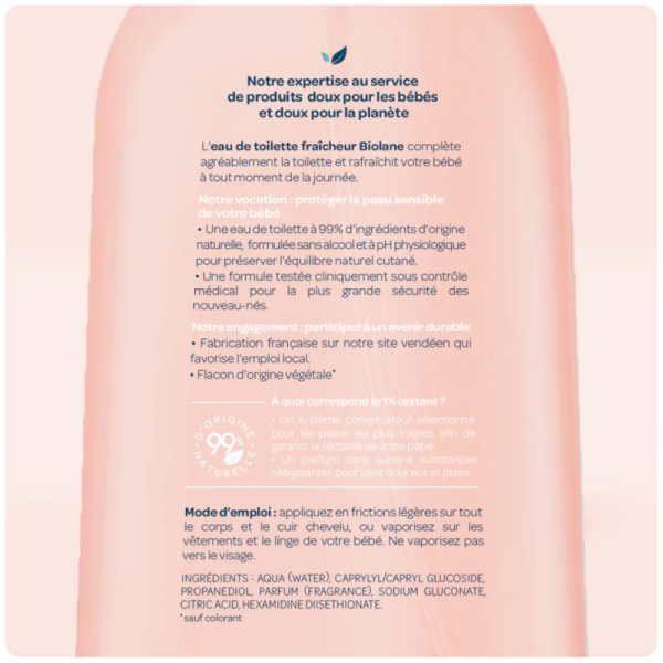 Formulated without alcohol and with a physiological pH, it preserves the skin’s natural balance and can be used safely on babies. Rich in pro vitamin B5, it makes the epidermis soft and supple.