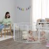 Providing a versatile way to keep your child safe, the Regalo Super Wide Baby Gate and Play Yard offers numerous convenient configurations for around the house. It can be used as a standalone play yard or a gate and is ideal for large, angled, or uneven openings.It is ideal as a play yard, fireplace barrier, at the landing of stairs, or a super gate for very wide openings. Includes eight 24” panels, can fit openings up to 192”. Wall mounting brackets add 2” to each side, 4” total, stands 28” tall, easy one-touch safety lock release lever. Convenient walk-through design,16″ wide door for easy pass-through. Easy setup and takedown with hardware mounts, some assembly required. Can be configured for multiple uses ,sturdy, all-metal frame. Made for children 6-24 months ,can also be used for medium to large dogs