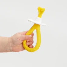 The Training Toothbrush for Babies is equipped with a triple-angle brush head made of phthalate-free silicone bristles to gently massage teeth and gums suffering from teething pain. Plus, the easy-hold loop handle makes it easy for baby to get a grip while the removable parent-proof stopper helps keep you brushing too far. Once they have a few teeth in, keep their good habits going with the Training Toothbrush for Toddlers – the next step on their way to the big [teeth] leagues.
