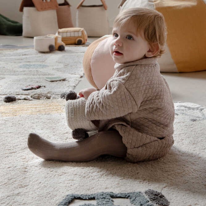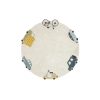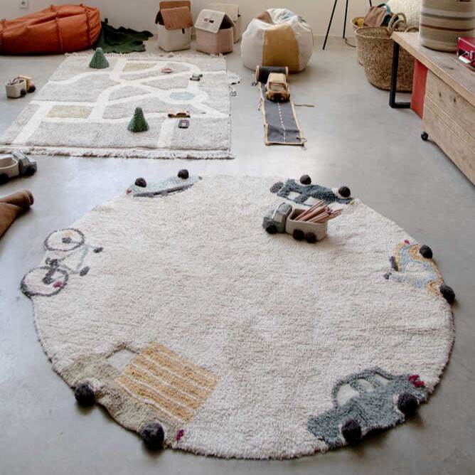 Round rug in natural color cotton decorated with electric cars, a truck, a bicycle and an electric vespa in shades of blue and olive colors. With cotton pom poms as wheels in dark grey color, the rug is made in a soft cut-pile leaving the windows of the cars with base canvas.